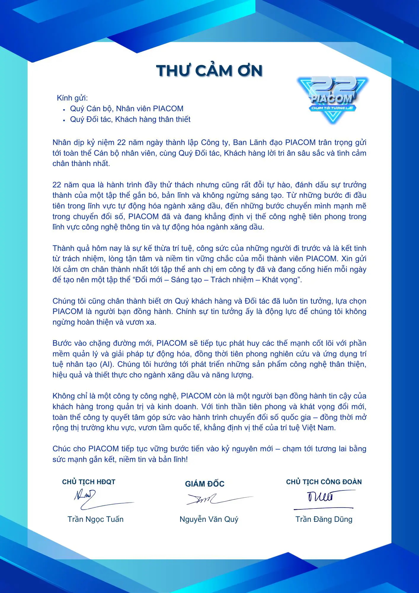 Thư cảm ơn của Ban lãnh đạo PIACOM gửi tới Quý đối tác, Khách hàng và Toàn thể nhân viên nhân dịp Kỷ niệm 22 năm ngày thành lập công ty (19/08/2003 - 19/08/2024)